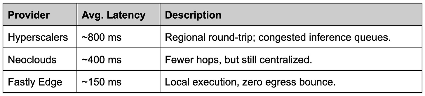 Fastly’s existing PoPs already sit within 10-30 ms of most major population centers. Add low-power GPUs (L4s, A10s, Groq LPUs — take your pick), and those same edge nodes can execute inference locally — roughly 3-5x faster than regional cloud zones and up to 10x faster than cross-continent calls to centralized GPU clusters.