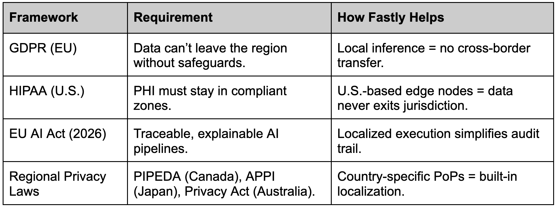 The third advantage isn’t about speed or cost — it’s about where your data sleeps at night. With AI inference, every cross-border hop can trigger a compliance migraine. Fastly’s edge footprint already sits inside most major data regimes — US, EU, UK, Canada, Japan, Australia — with local colocation, power, and network presence. If inference happens there, it stays there.