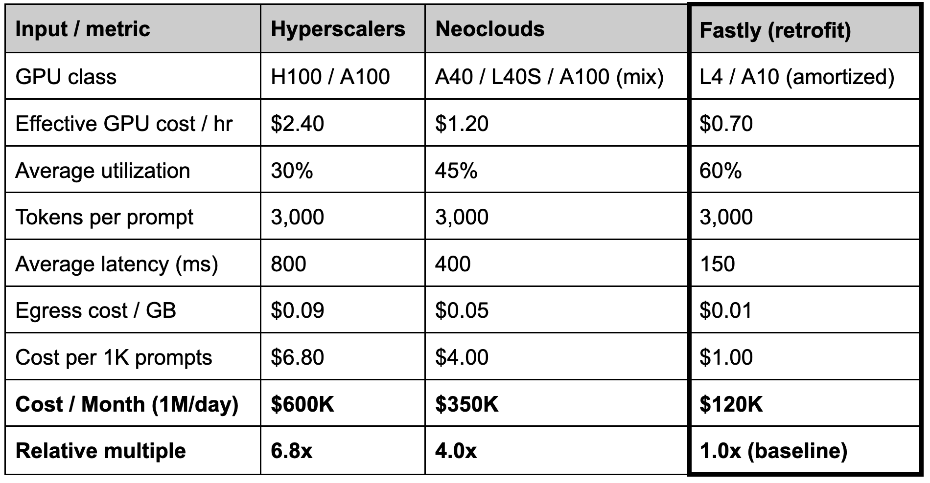 A moderate model (3K tokens per request, mix of RAG and generation) serving 1M prompts a day costs ~$600K/month on AWS — about $0.04 per prompt. Running the same workload on a neocloud like CoreWeave or Lambda drops that to about $300K/month ($0.02 per prompt). On Fastly’s existing PoPs, using L4 or A10-class GPUs amortized over 3-5 years, the number falls to $100-200K/month; i.e., 75-90% cheaper than hyperscalers and ~50% cheaper than neoclouds.