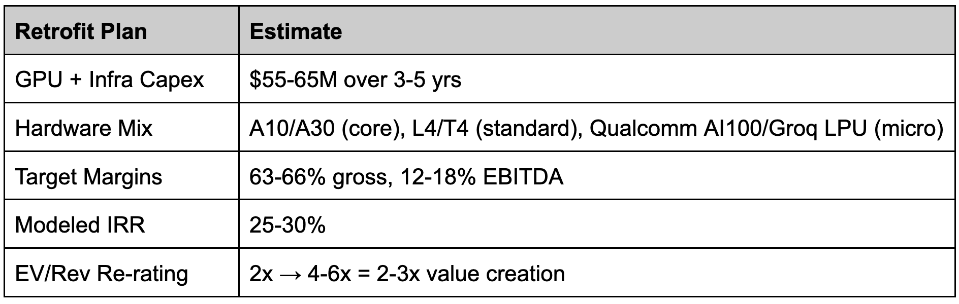 The beauty of this isn’t in some moon-shot rebuild (even if it still qualifies as a pipe dream); it’s in the reuse. CDN traffic yields ~55% gross margins. Edge inference? ~75%. That’s a 500-1,000 bps lift on blended gross (and likely EBITDA) margins — plus faster revenue growth because inference isn’t an add-on — it’s a new business hiding in the old one. Same pipes, new payload, better margins, faster growth, higher multiple.
