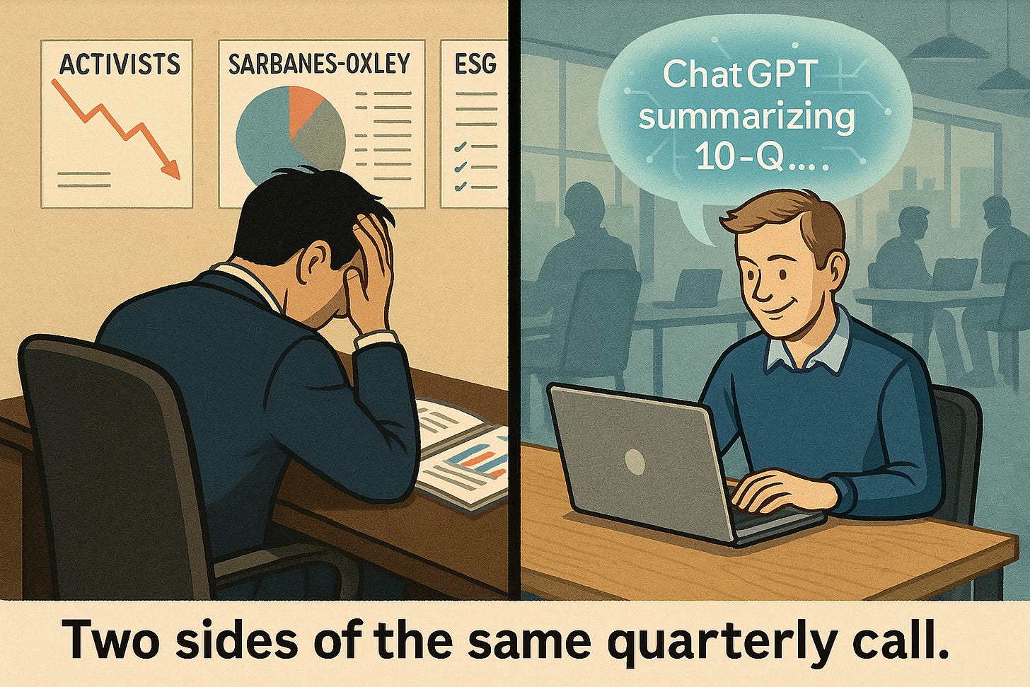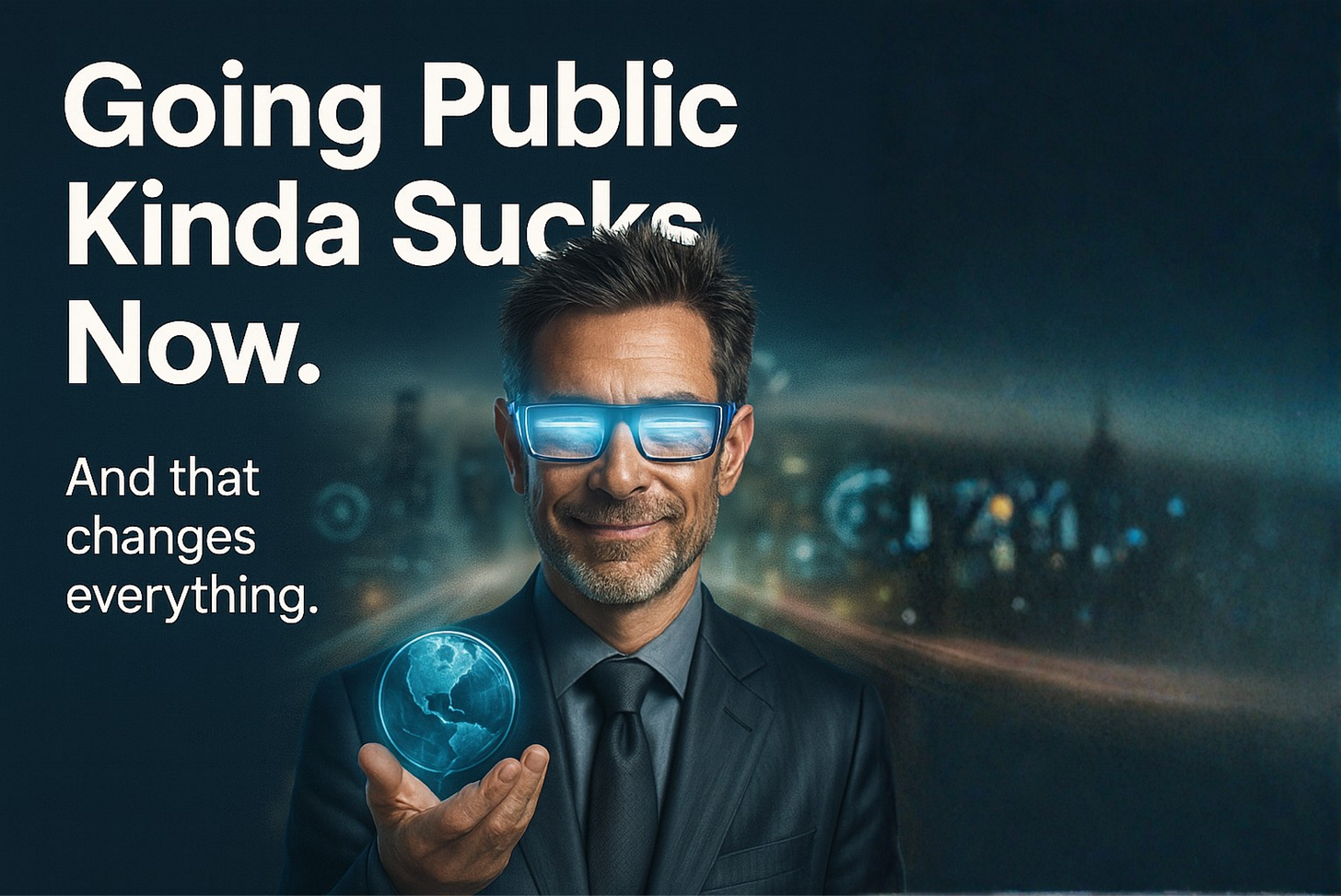 Today’s public markets resemble a compliance marathon in stiff (unironic) dress shoes. The regulatory load is heavier with Sarbanes-Oxley Act, ESG demands, activist pressure, quarterly disclosure treadmill. Being public now means navigating quarterly expectation inflation, investor activism, nagging overhead, and smart-ass, inexperienced analysts (broad)casting judgment on how you run a business they know nothing about other than what ChatGPT told them after a copy / paste sesh with an SEC filing.